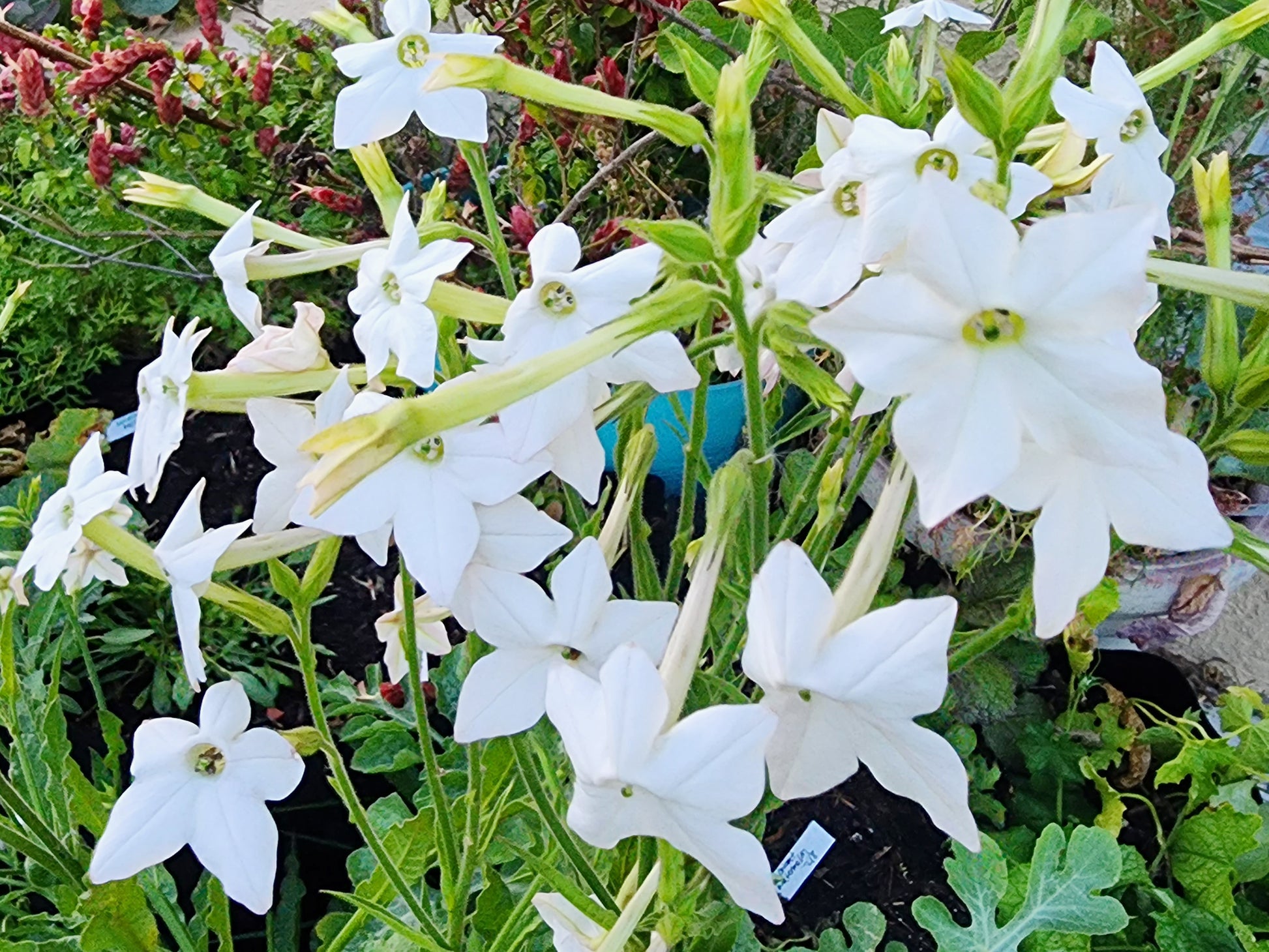 Nicotiana also known as flowering tobacco is a wonderfully fragrant addition to your garden. Plants get up to 3 feet tall and produce clusters of tubular shaped flowers. They are quite fragrant, and when planted together in a large mass, will fill your garden with its floral scent. The white color of these flowers stand out in the garden during the eveing and night. They grow best in full sun and well draining soil.